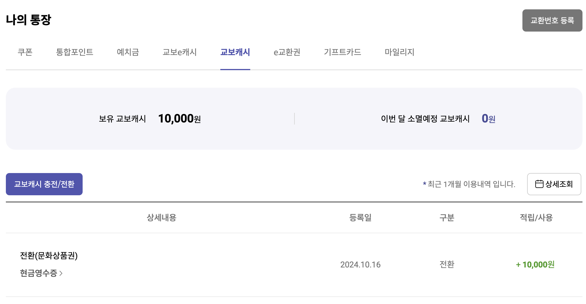 그러면 문화상품권의 금액만큼 교보캐시가 아래와 같이 전환된 것을 확인할 수 있어요. 이 교보캐시를 이용해서 책을 구매할 때 사용하면 됩니다.