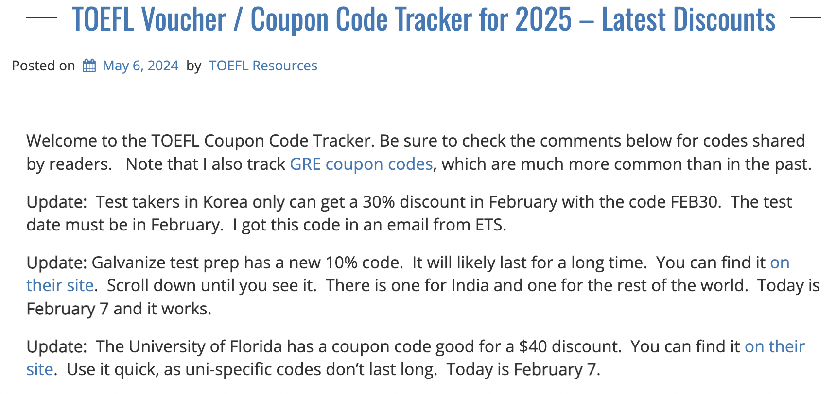 토플 응시료 할인 코드가 수시로 올라오는 사이트가 있습니다. 토플을 접수할 때 이 코드를 적용하면 할인받을 수 있는데요. 특정 국가 또는 특정 조건에만 적용가능한 코드도 있으니 잘 확인해서 적용해보세요. 저도 이 할인 코드를 자주 이용했답니다. 토플 뿐만 아니라 GRE 할인코드도 종종 올라와요.
