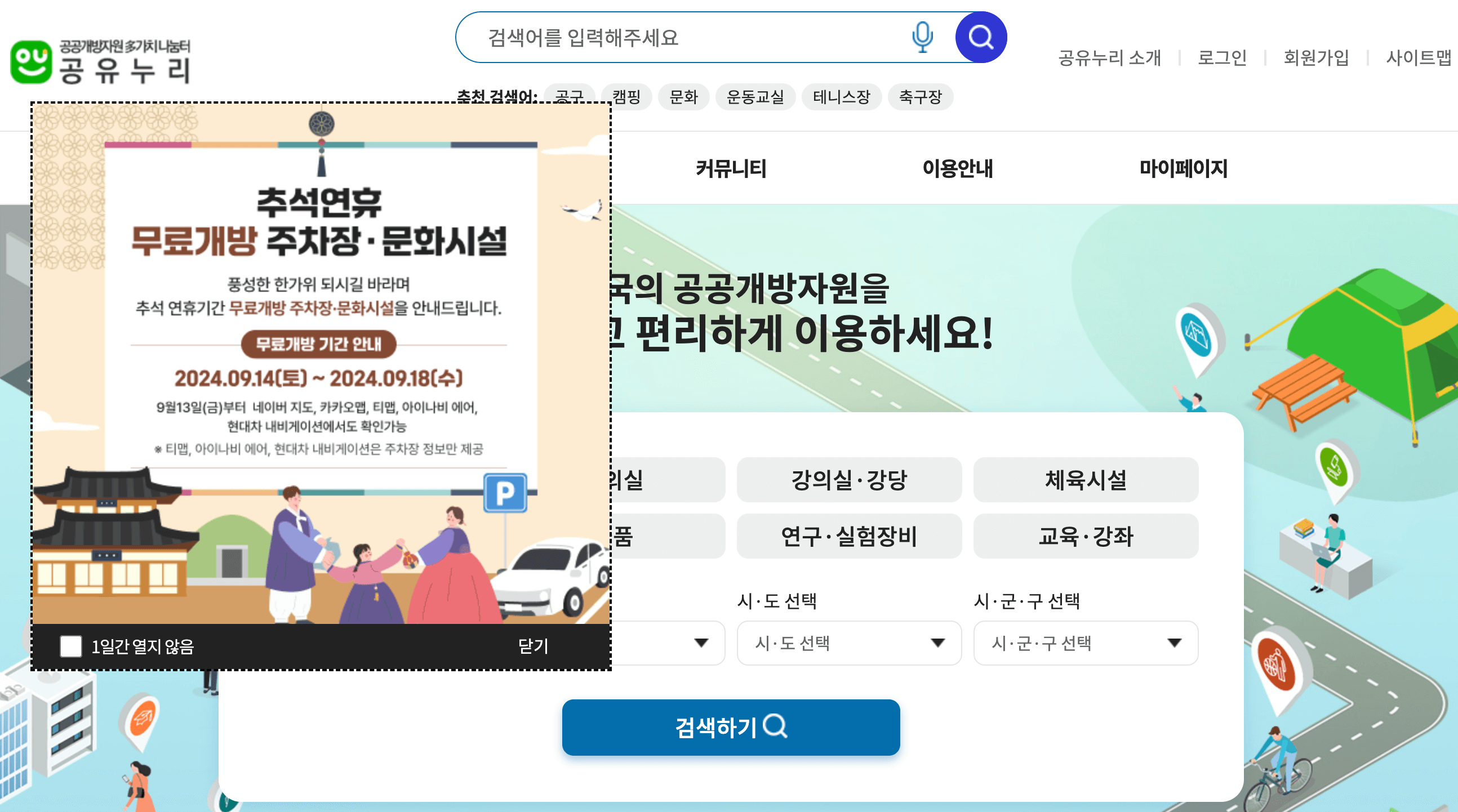 공유누리 메인 화면에 들어가면 바로 무료 주차장을 검색화면으로 연결되는 팝업창이 떠요. 팝업창을 클릭해주세요.